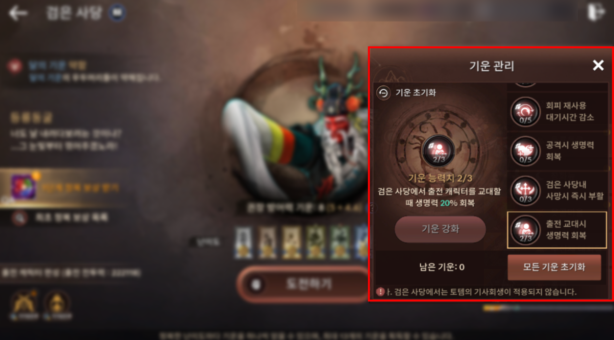기운 효과에 '출전 교대 시 생명력 회복' 효과가 추가되어 더욱 전략적인 플레이를 하실 수 있을 것입니다.