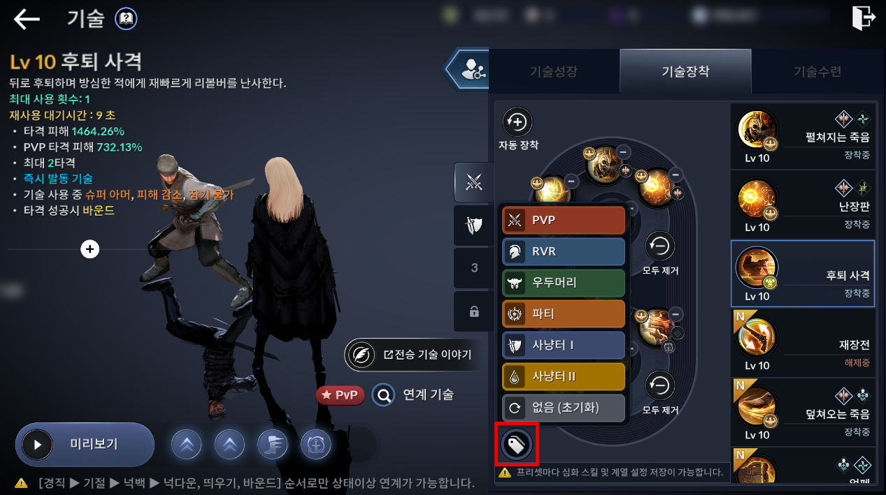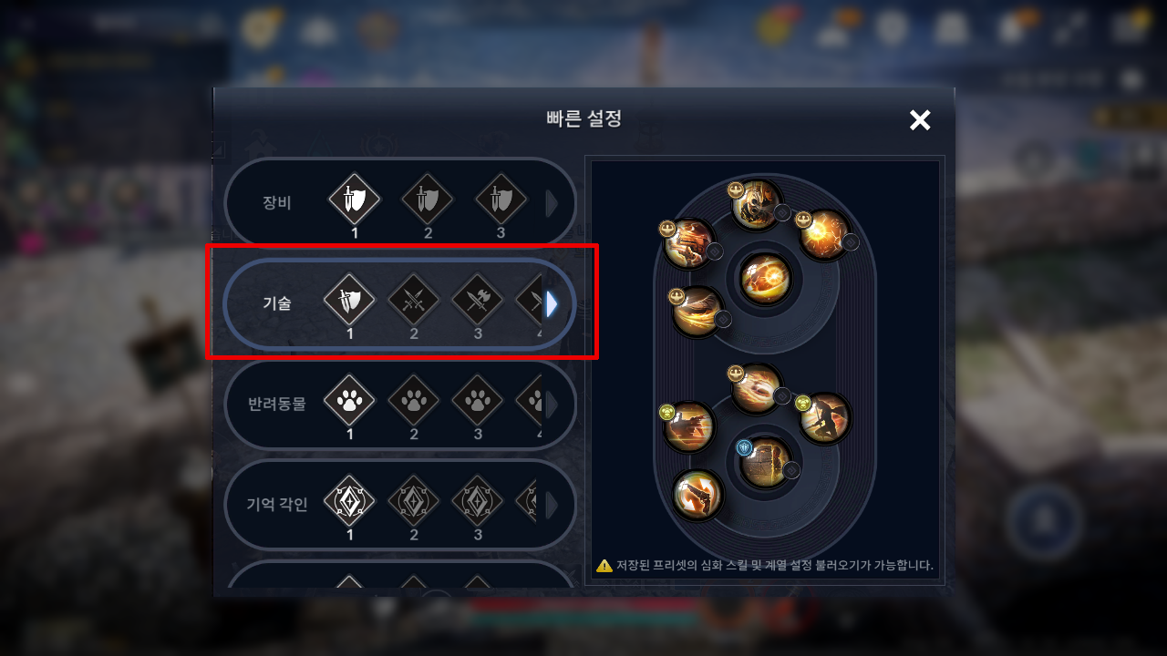 - [메뉴] - [기술] - [기술 장착]에서 각 프리셋에 태그를 설정할 수 있습니다.