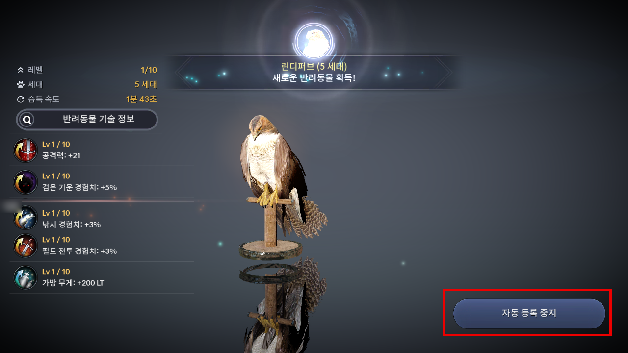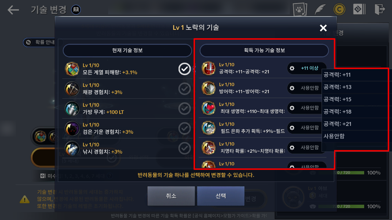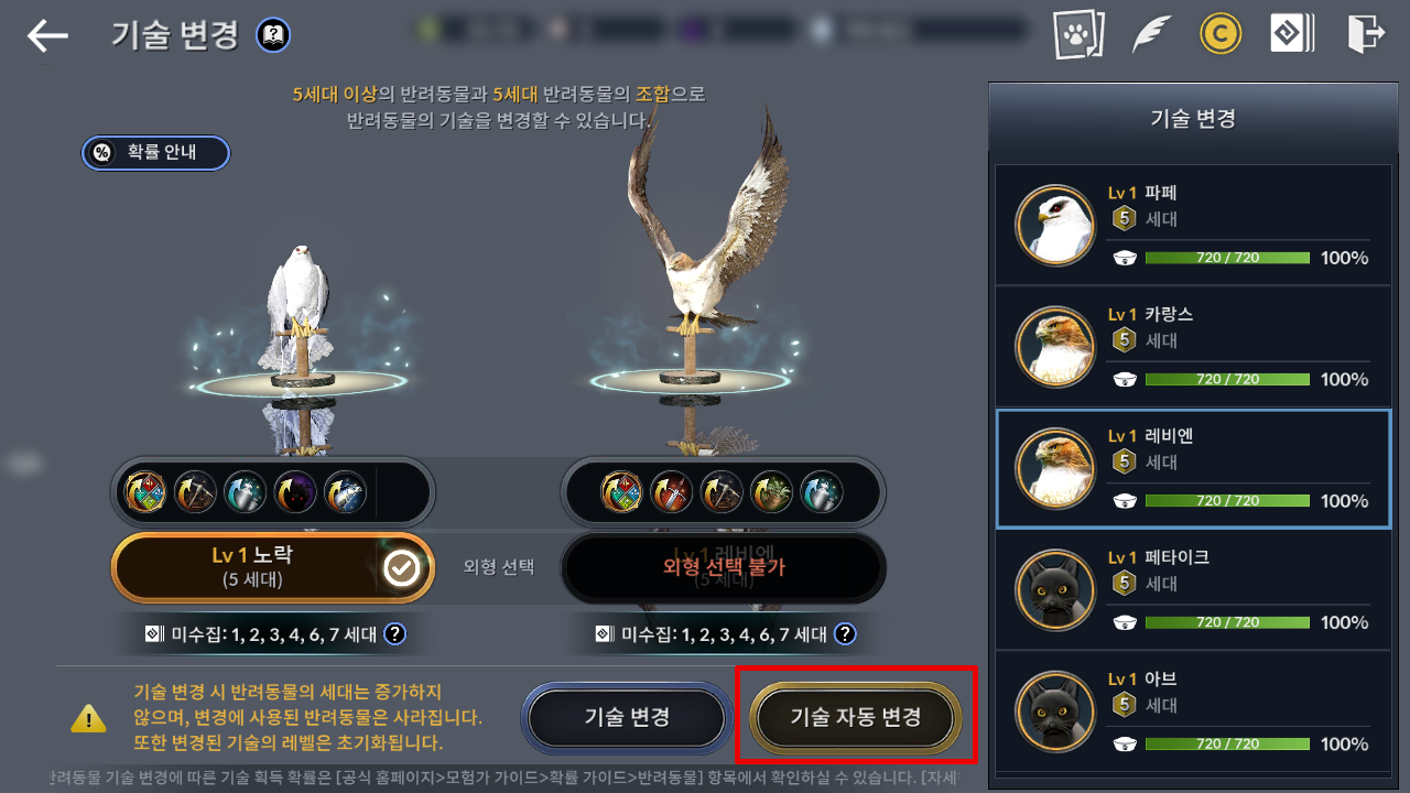 - [메뉴] - [반려동물] - [기술 변경] - [기술 자동 변경]에서 원하는 기술을 획득할 때까지 자동으로 기술 변경을 진행할 수 있습니다.