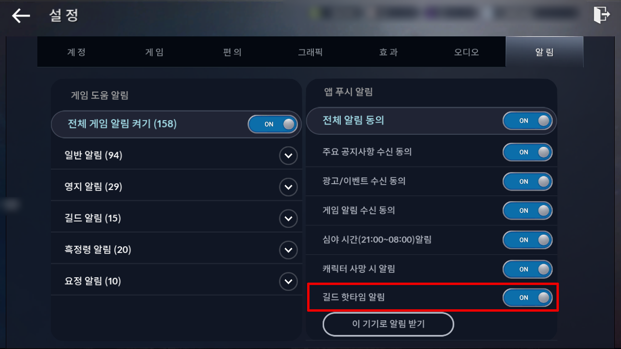 - [메뉴] - [설정] - [알림]에서 길드 핫타임 시 푸시 알림을 받을 수 있도록 추가됩니다.
