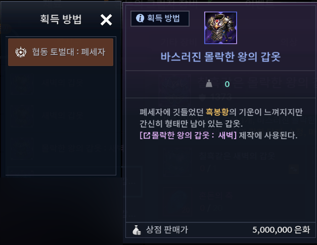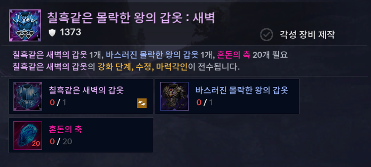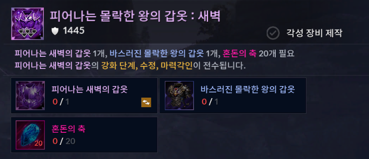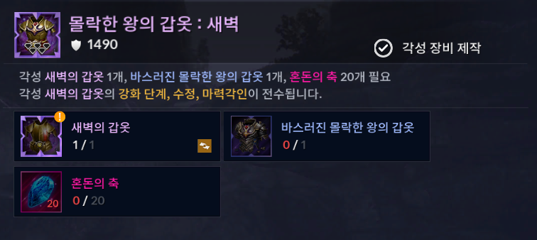 - ‘바스러진 몰락한 왕의 갑옷’ 및 ‘혼돈의 축’을 재료로하여 ‘몰락한 왕의 갑옷’을 제작할 수 있습니다.