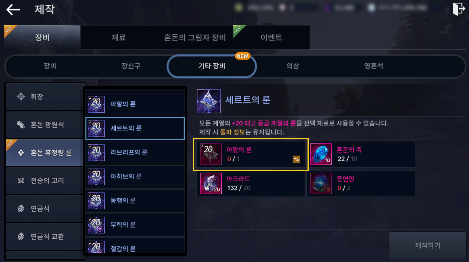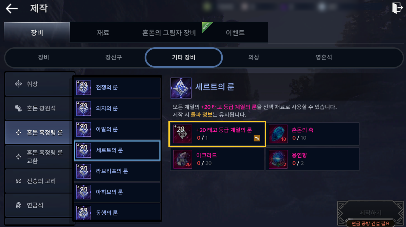 ① 세르트 계열을 제외한 +20단계 이상 혼돈 등급 계열의 룬 재료 등록 가능 (아알/라브리프/아히브의 룬 중 1개)