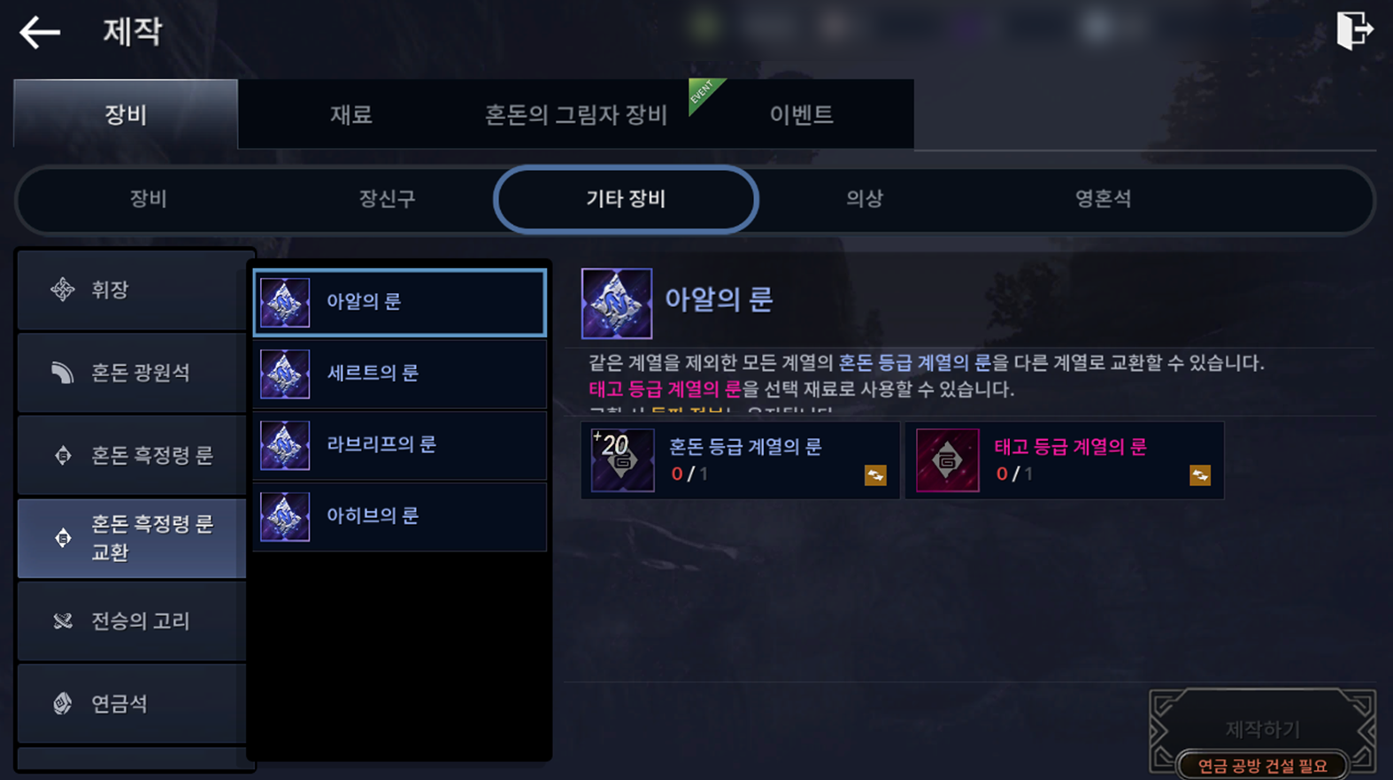 - [메뉴] - [제작] - [장비] - [기타 장비] - [혼돈 흑정령 룬 교환]에서 혼돈 등급 계열의 룬을 다른 계열로 교환할 수 있도록 추가됩니다.