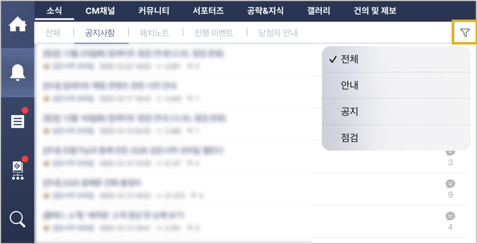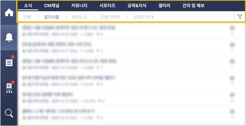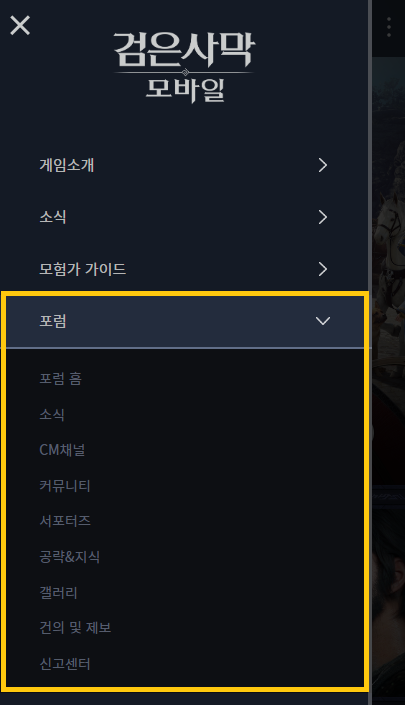 - 게임 내 공식 포럼 화면 상단에 메뉴(소식, CM채널, 커뮤니티 등)바가 추가됩니다.