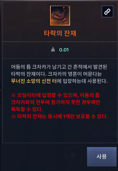 - ‘봉인된 어둠의 기운’ 아이템 설명에서 ‘타락한 대지 전리품 상자’ 아이템 확인 시 ‘(구)타락한 대지 전리품 상자’ 설명이 표기되던 현상이 수정됩니다.