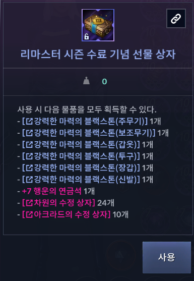내용 : 리마스터 기념 임무를 완료하고, 리마스터 기념 꾸러미를 획득해 보세요!