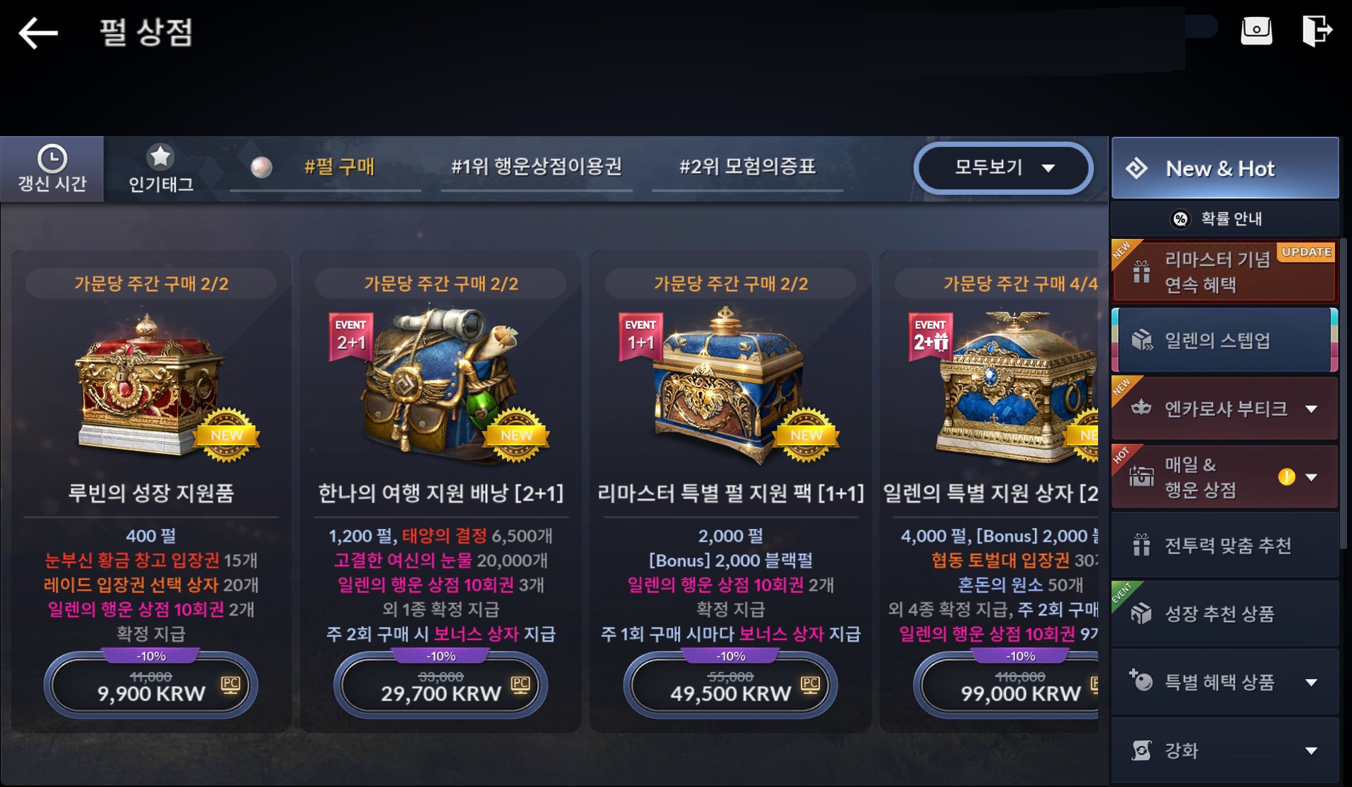 | 선물 상품 | - 가문 당 주간 2회 구매 시마다, '일렌의 행운 상점 10회권' 9개가 추가 지급됩니다. | |