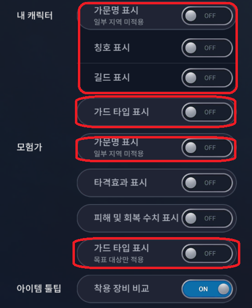 만일 내 캐릭터의 가문명/칭호/길드 모두 보이게 하고싶고 상대방은