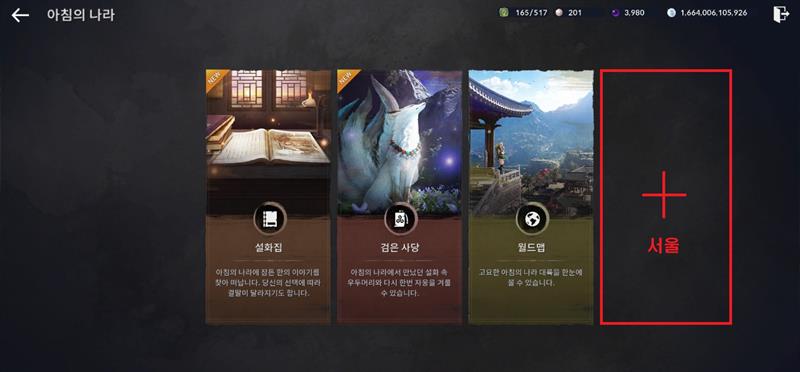 아니면 [아침의 나라 1] 맵 좌측 상단에 열 수 있는 드래그 바를 만들어서 누르면 [아침의 나라 : 서울] 맵을 볼 수 있는 기능이 추가되면 어떨까 싶더라고요.