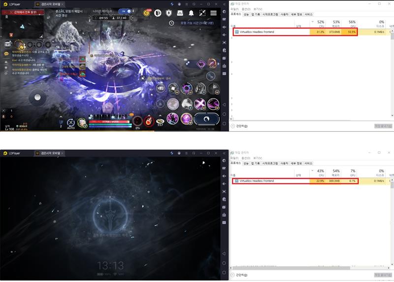 기존에 사용한 LD플레이어는 "절전모드"로 하고 자동 사냥을 돌리면 확실히 컴퓨터에 무리가 가지 않습니다.