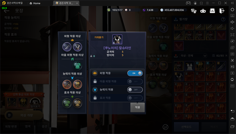 다른 의상은 정상적인것같은데, 칼슈타인 의상을 외형적용하면 화면이 깨집니다. (필드사냥도 깨쪄서 나오는것 같습니다.)
