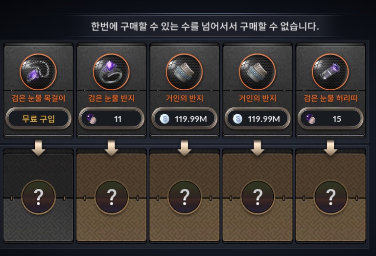 현재 장신구 상점에서 무료 구입 클릭시 "한번에 구매할 수 있는 수량을 넘어서서 구매할 수 없습니다." 메시지가 뜨면서 상품 구입이 안되고 있습니다,