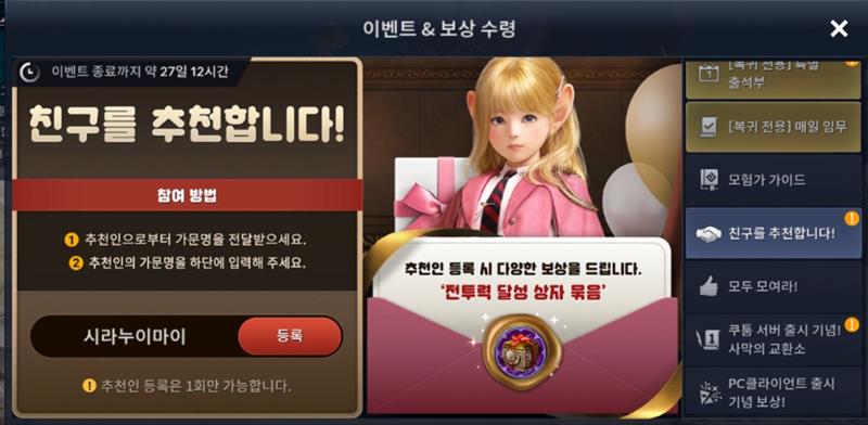 신규복귀시, '잿빛령' 추천하셔서 전투력 보상상자 받아가세요!!