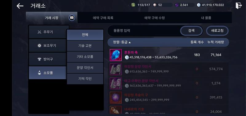 겜하다 중간중간 거래소 들어가면 장신구나 재료, 잠재력 항목이 사라지고 저렇게만 뜨네요 수정좀 부탁드려요