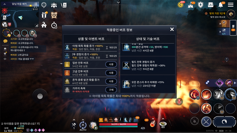 현재 적용중인 경험치 버프량, 아이템획득확률 등 총 적용치를 표시해주는 편의성 개선 요청드립니다.