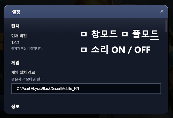0. PC 버전 최소 설치치 컴퓨터 최대 해상도 강제 풀 모드 및 소리 출력 선택 할수 있도록 런처 수정 요청