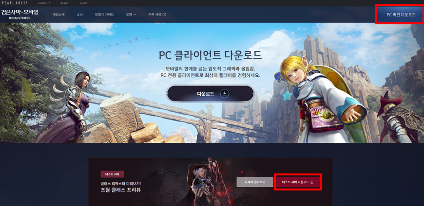 - 검은사막 모바일 공식 홈페이지 우측 상단의 [PC 버전 다운로드] 버튼을 눌러
