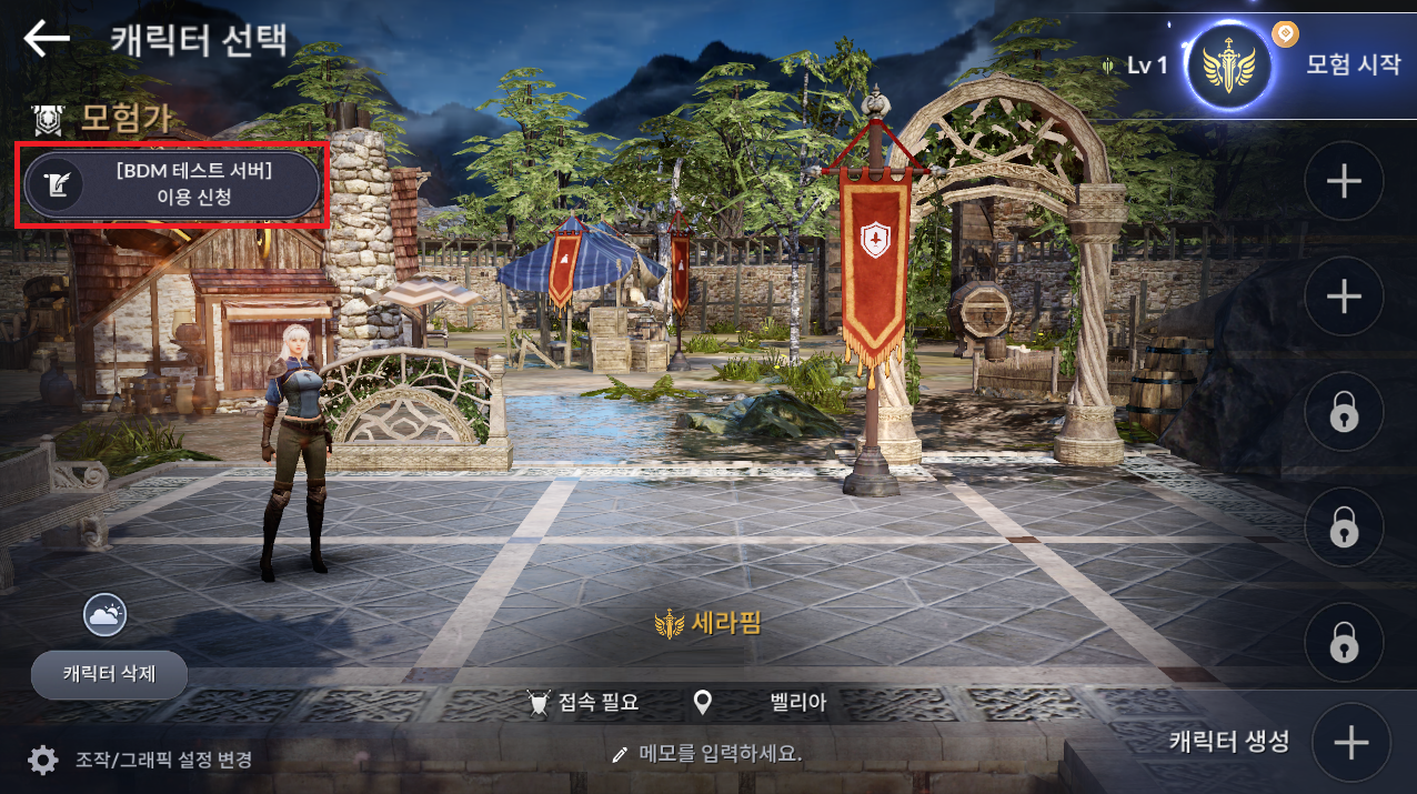 - 테스트 서버를 이용하기 위해서는 ‘공식 서버’의 캐릭터 선택 화면 좌측 상단에서 [BDM 테스트 서버] 이용 신청 버튼을 눌러 신청할 수 있습니다.