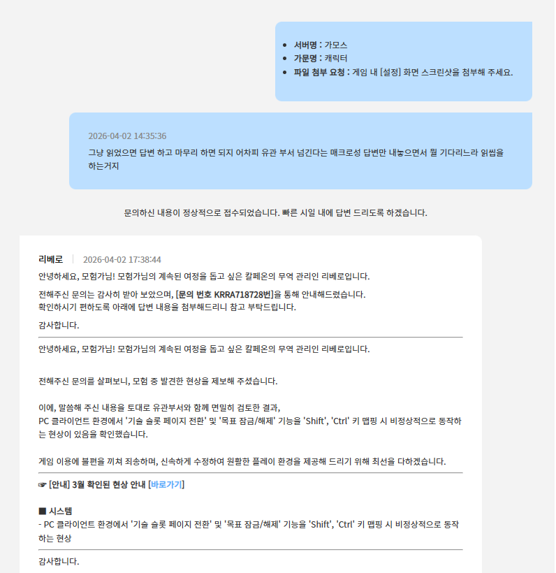PC클라이언트 키 버그 수정해준다고 함. [1] 캐릭터 2026-04-03 13:56 259 0 2026-04-03 13:56 259 0